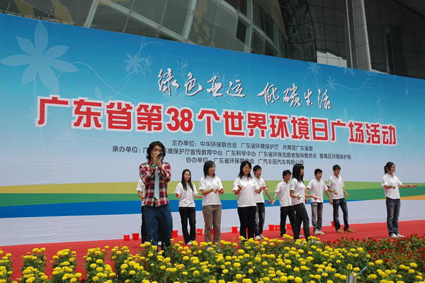 此次广东省第38届环境日广场活动主题“绿色亚运·低碳生活”。参与活动的3000多名志愿者和群众及奥运冠军劳丽诗等志愿者代表的带领下,齐声喊出了支持绿色亚运环保行动的口号:“我倡导、我支持、我参与、我行动”。